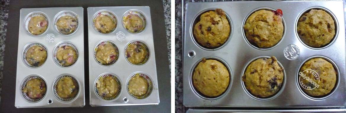 ผสมไข่ น้ำมันพืช และ โยเกิร์ตเข้าด้วยกัน แล้วเทลงในชามแป้ง ตามด้วยเบอรี่ ผสมให้พอเข้ากัน (อย่าคนมากไปนะคะ เพราะจะทำให้มัฟฟินเหนียวค่ะ)