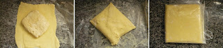 ห่อโดแป้งด้วยโดเนย โดยใช้วิธีพับทั้ง 4 มุมเข้ามา กดให้โดเนยหุ้มแป้งจนสนิท แล้วห่อด้วย พลาสติกแร็ปนำไปแช่เย็น 30นาที