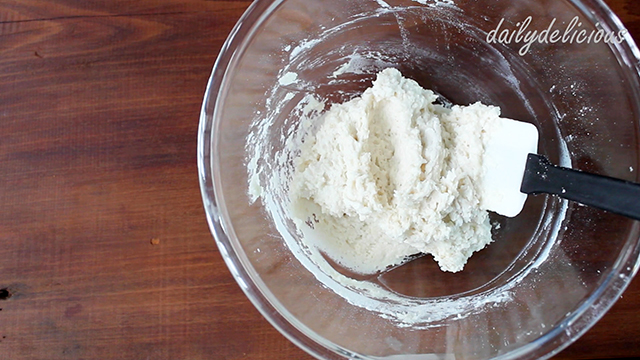 ใส่ช็อตเทนนิ่งลงไป แล้วตัดให้เข้ากัน ด้วยที่ตัดแป้ง